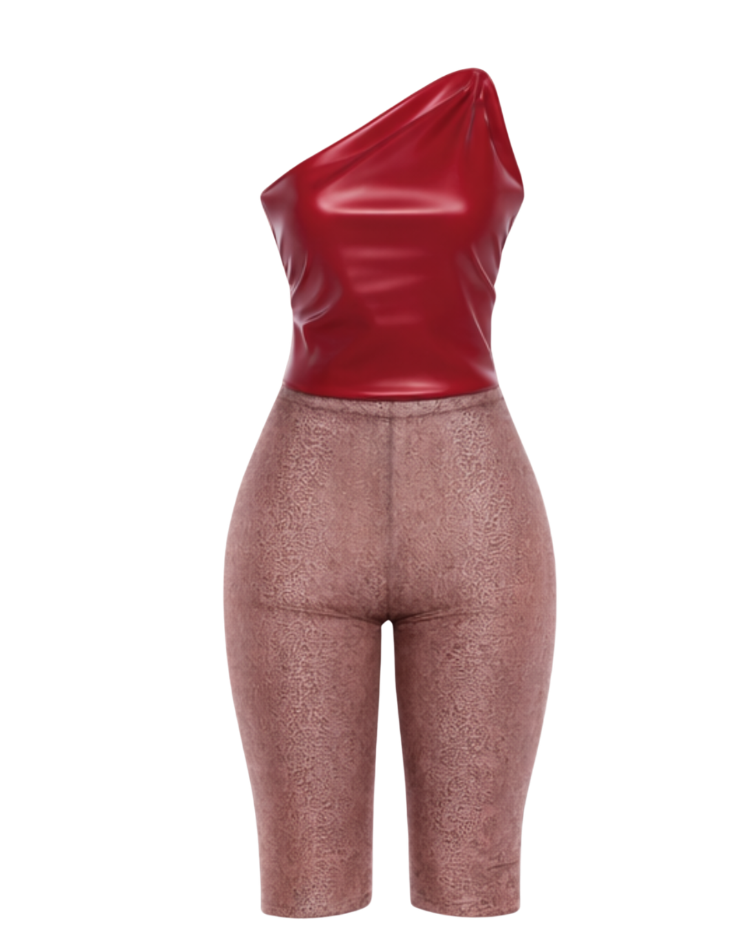 This statement set features a glossy red one-shoulder top paired with high-waisted textured capris pants for a curve-hugging, snatched fit. Designed to turn heads at dinners, nights out, and special occasions.